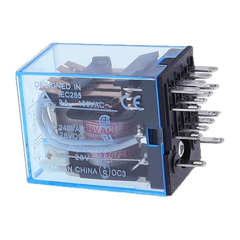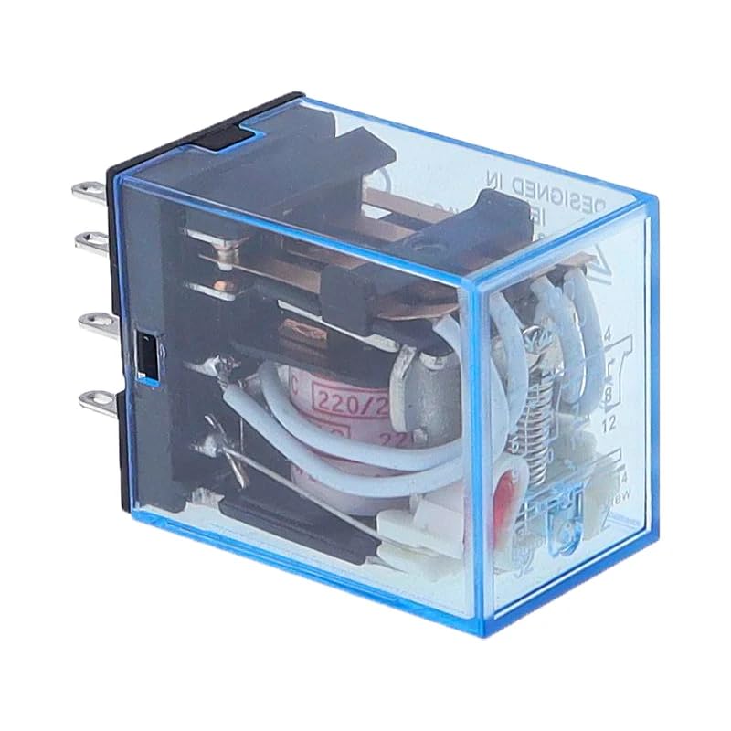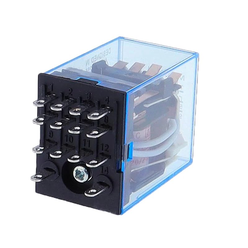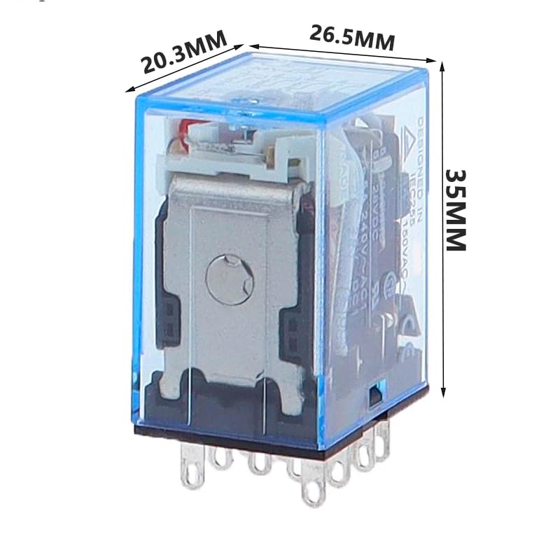 This versatile MY4 general purpose relay features a robust 4PDT (4 Pole Double Throw) configuration with 14 pins, making it an ideal choice for complex switching applications. The relay's multi-voltage compatibility allows seamless operation across various power sources including 12V, 24V, 110V, and 220V in both AC and DC systems. Its transparent blue housing provides visual confirmation of the internal mechanism's operation while protecting the contacts. The compact design incorporates reliable switching mechanisms suitable for industrial control systems, automation equipment, and various electrical applications. With multiple contact arrangements, this relay offers flexible circuit control options in a single unit. The durable construction ensures consistent performance in demanding environments, while the standardized pin configuration enables straightforward installation and replacement. Perfect for both new installations and maintenance replacements, this relay serves as a dependable component for switching and control circuits across diverse applications.